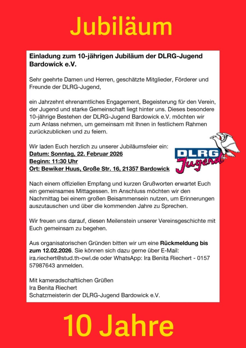 ein Jahrzehnt ehrenamtliches Engagement, Begeisterung für den Verein, der Jugend und starke Gemeinschaft liegt hinter uns. Dieses besondere 10-jährige Bestehen der DLRG-Jugend Bardowick e.V. möchten wir zum Anlass nehmen, um gemeinsam mit Ihnen in festlichem Rahmen zurückzublicken und zu feiern.